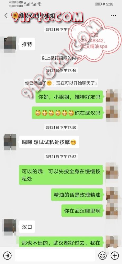 我是武汉男,大学本科毕业,会精油按摩spa,有玫瑰精油,主要按头部,脖子,肩膀,背部,臀部,腿部的,扣扣305748342,希望武汉的夫妻情侣单女加我哦,单男勿扰。
